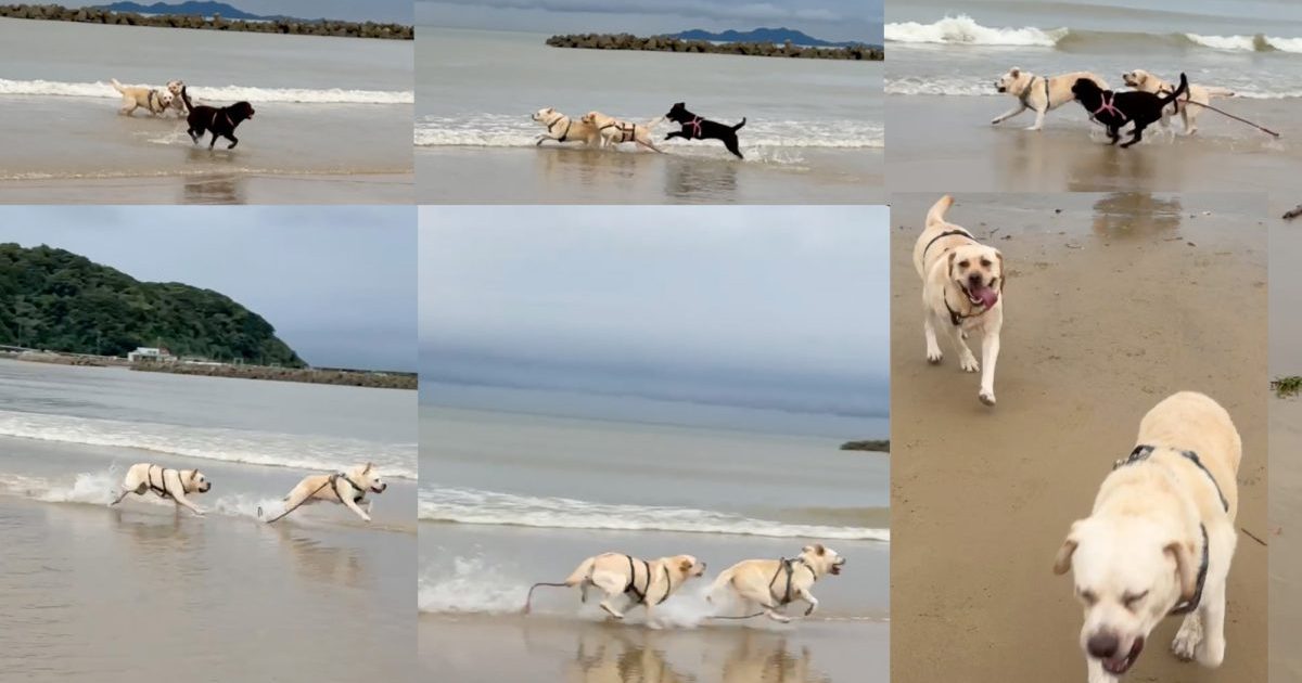 初めての海に大はしゃぎ!全力疾走で嬉しさ爆発の2頭です